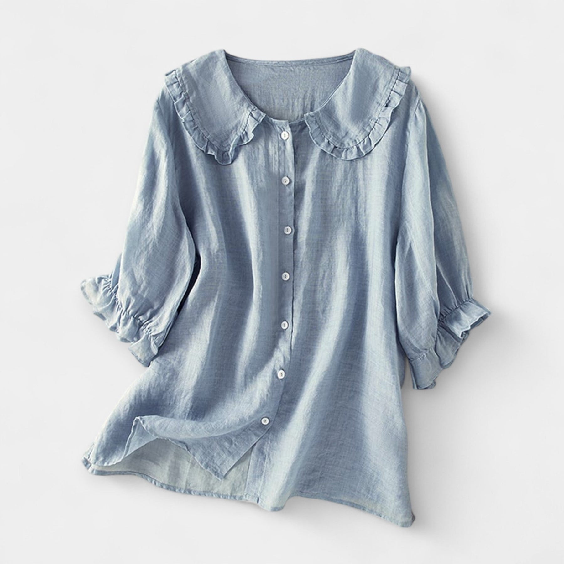 Zabawna koszula wykonana z lekkiej mieszanki bawełny i lnu, łącząca elegancję i komfort. Kołnierzyk Peter Pan z falbankami dodaje dodatkowego detalu, który nadaje każdej casualowej stylizacji nowy charakter, idealny w połączeniu ze spódnicami lub spodniami.