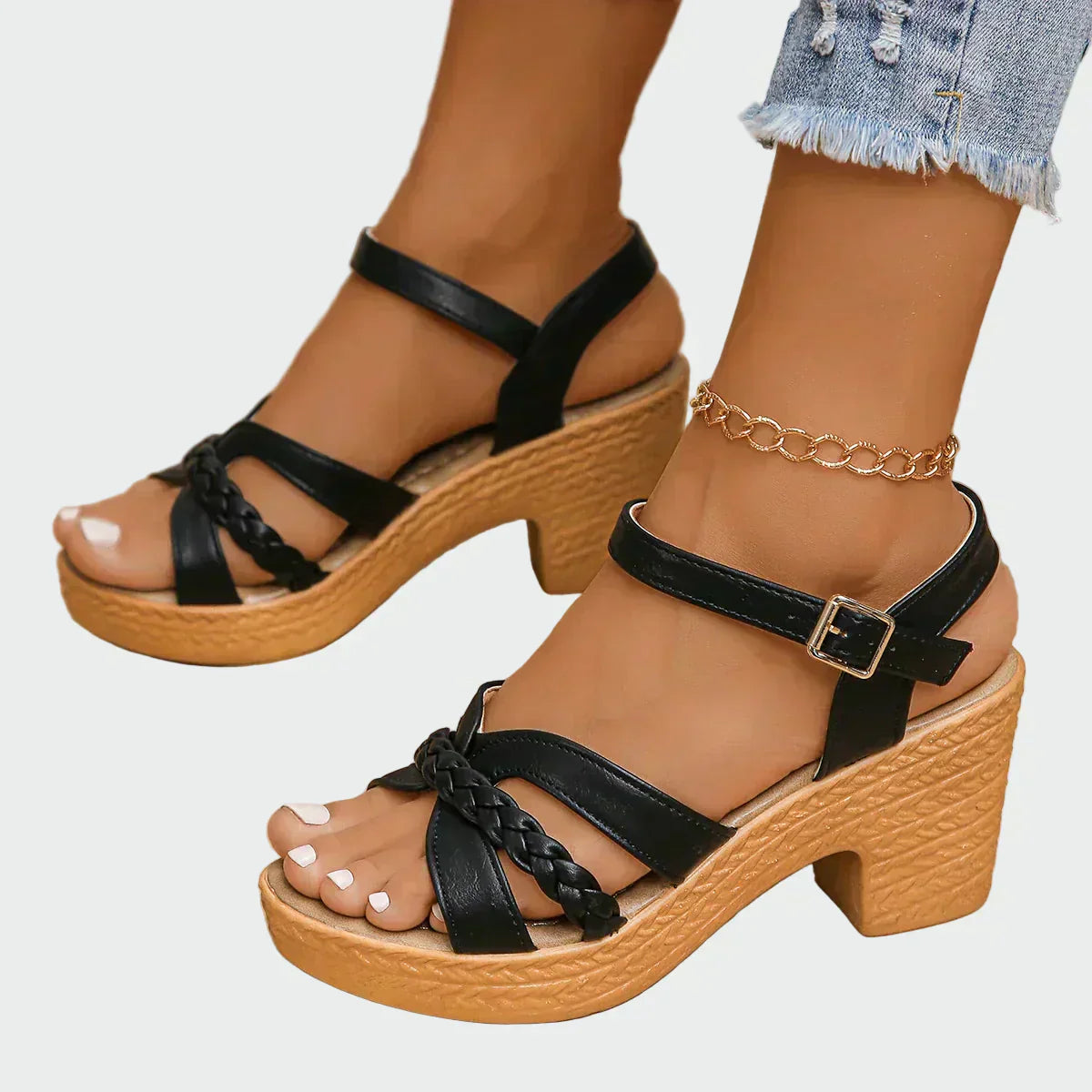 Modne czarne sandały na platformie i obcasie są odpowiednie do codziennego noszenia, zapewniając stylowy i wygodny wygląd. Połączenie plecionego przedniego paska i klasycznych linii dodaje elegancji, a brązowa korekowa podeszwa nadaje letni charakter.