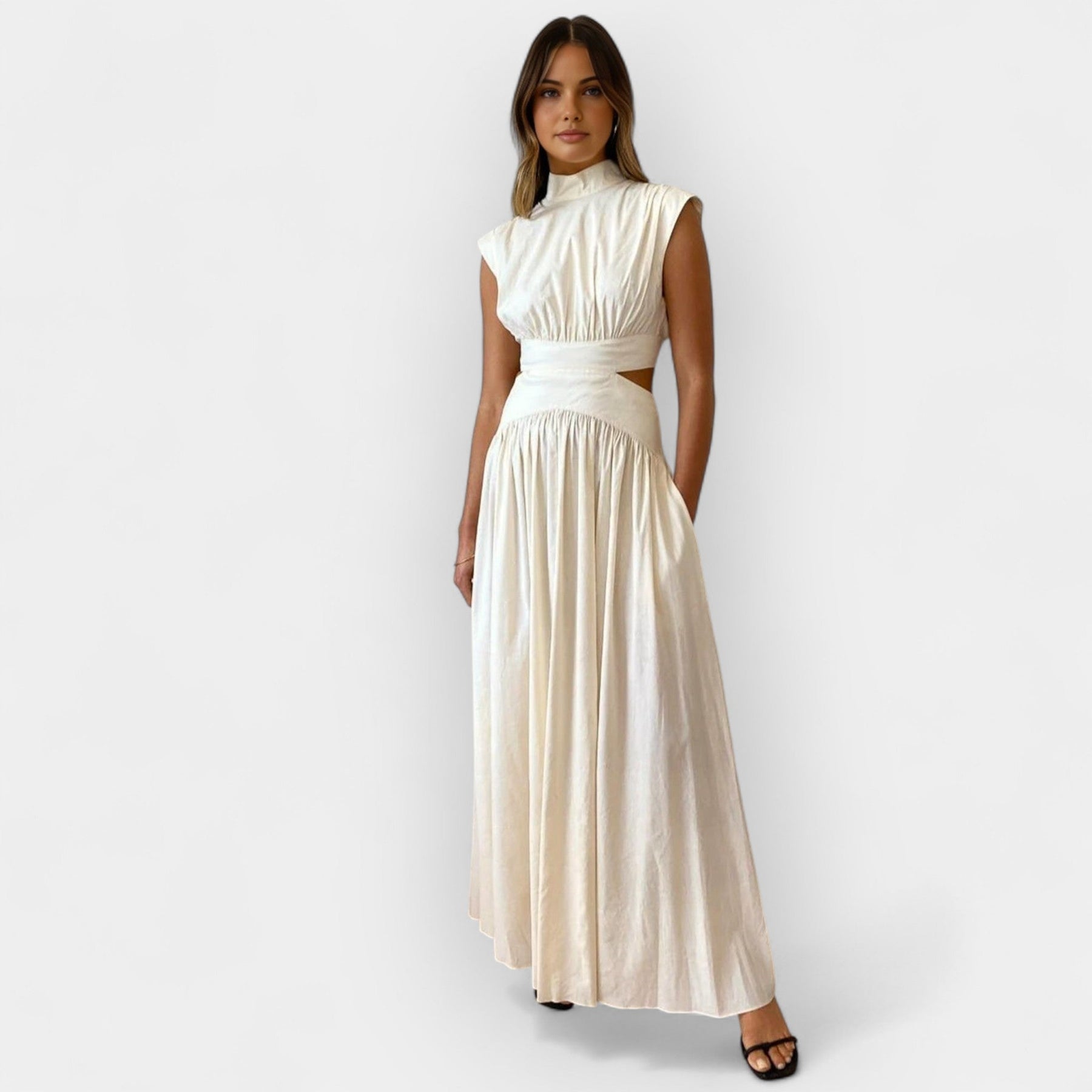 Oszałamiająca sukienka, która łączy zamknięty dekolt z nowoczesnymi otworami, tworząc nowoczesną i kobiecą sylwetkę. Idealna na wyjątkowe wieczorowe stylizacje z subtelną odwagą.